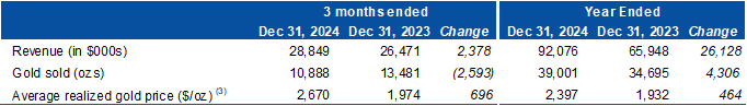 The Company's financial results for Q4 2024 reflect record gold sales of $28.9 million, which generated $14.7 million in Mine Operating Cash Flow (1) (4), and $4.7 million in Net Income after accruing a non-current deferred tax liability of $3.2 million due to greater than expected operating income consuming a greater than expected portion of the Company's deferred tax assets. The Company sold 10,888 oz of gold at an average price of $2,670 per oz with a $1,352 All-In Sustaining Cost ("AISC") ($/oz sold). (1) (2)