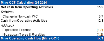Q4 2024 - Mine OCF Calculation and Cash Reconciliation (in $ million)