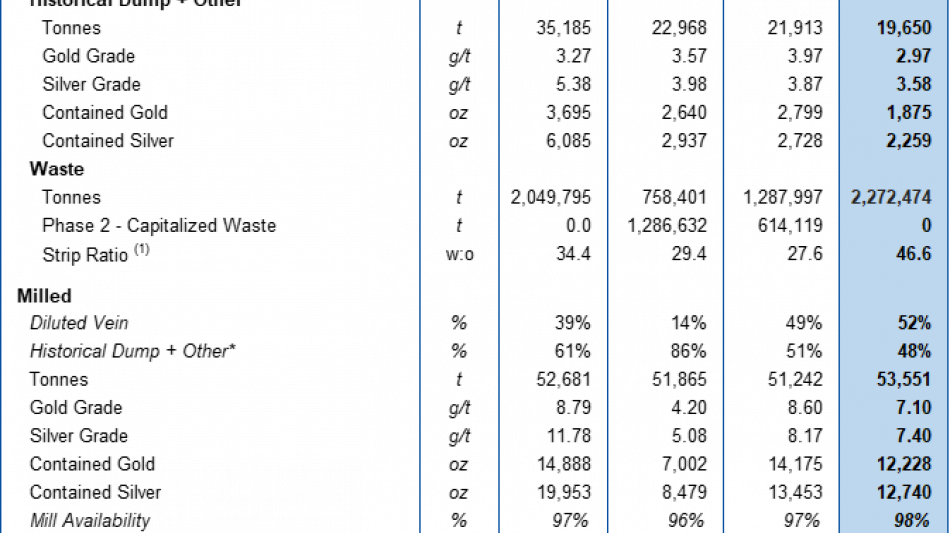 29,163 tonnes mined from diluted vein material containing 9,620 oz Au at 10.26 g/t Au and 9,777 oz Ag at 10.43 g/t Ag