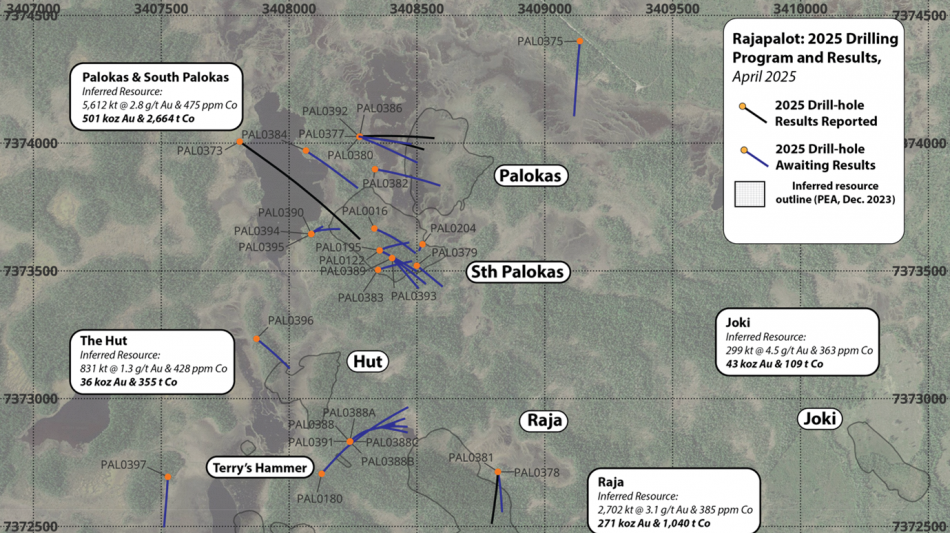 Raja Deeps: Target-test drilling (drillhole PAL0388) of a conductive anomaly defined through DHEM geophysics, located in the down-plunge/down-dip position of the Raja projected mineralised zone (see news release dated February 11, 2025) has intercepted a 11.3 metres interval of disseminated to semi-massive iron-sulfide (pyrrhotite and pyrite with chlorite alteration; typical gangue mineralogy of Rajapalot gold-cobalt mineralisation), starting from 666.4 metres downhole; see Figure 2 and Figure 3. Visible gold was observed in drill-core at 668.5 metres (see Figure 3) suggesting this intercept in PAL0388 is indeed gold-bearing. It is important to note that analysis for gold has not yet been undertakenon this drillhole, and gold grades are unknown at present time. Three additional 'navi' wedge holes were drilled off PAL0388 in order to follow up this intercept (collared between 420 and 462 metres downhole), where PAL0388a returned a visual intercept of a 2.75 metre interval of disseminated to semi-massive sulfide from 690 metres (step-out ~30 metres to the north of PAL0388), and PAL0388b returned a visual intercept of a thinner 0.8 from 688 metres (step-out of ~22 metres to the south of PAL0388). PAL0388c intercepted a thicker visual intercept of 9.9 metres 676.4 metres downhole in a ~47 metre step-out to the south of PAL0388. Drillhole PAL0388 is located approximately 135 metres down-plunge of the nearest drillhole from the Raja zone (historical drillhole PAL0230), while PAL0388c is located approximately 180 metres from PAL0230 in Raja zone, representing that these are potentially significant step-out intercepts. Assay data for these drillholes will become available over the coming several weeks.