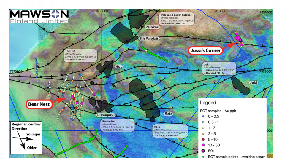 Figure 5. Preliminary gold-analyses from BOT drilling from 2025. To date, two areas with anomalous gold concentrations (>10ppb Au) from soil samples directly overlying bedrock are identified from Jussi's Corner, and Bear Nest.