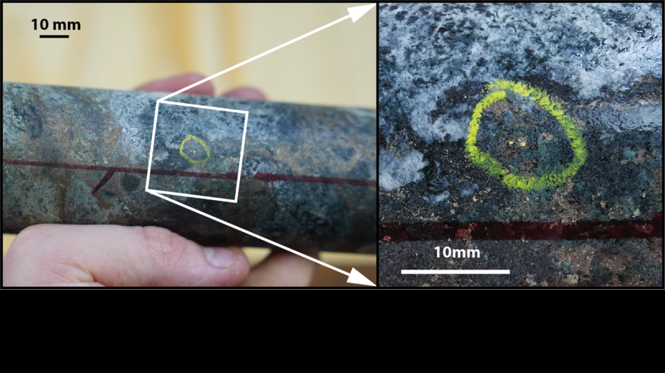Figure 3: Core photograph of sulfidic-rich interval of drillhole PAL0388 from Raja Deeps showing 2 visible gold grains observed within pyrhotitic disseminations (gold grains pictured in centre of yellow circle) from 668.5 metres down-hole. NQ2 core (50.2mm) for scale. It is important to note that analysis for gold has not yet been undertaken on this drillhole, and gold grades are at present unknown.