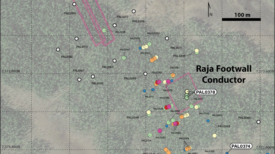 Confirmation of 'off-hole' DHEM conductor at Raja Deeps with 11.3 metres of disseminated to semi-massive Fe-sulfides drilled from 666.4 metres in PAL0388, with visible gold observed at 668.5 metres downhole (See Figure 3; assays not yet received), hosted in strongly chlorite-altered rocks