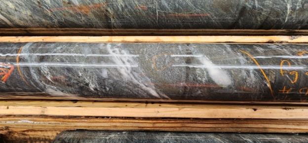 Photo 2: GTCM25-056A at 2695.33 metres downhole showing blocky arsenopyrite along vein margins