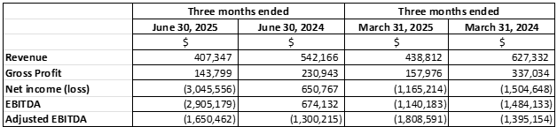Revenue for the second quarter of 2025 decreased to $407,347 in comparison to first quarter 2025 revenue of $438,812 and Q2/2024 revenue of $542,166. Adjusted EBIDTA loss for the second quarter of 2025 decreased in comparison to the first quarter of 2025 primarily due to foreign exchange rate movements as the Canadian dollar strengthened against the U.S dollar and increased as compared to Q2/2024 due to increased personnel costs related to additional hiring.