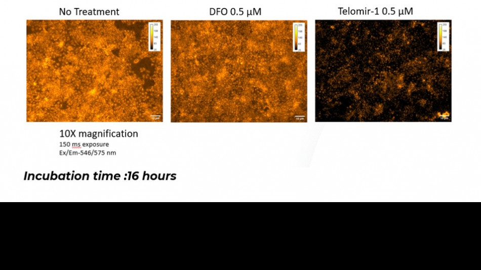 The study employed FerroOrange, a fluorescent probe that selectively detects ferrous iron (Fe²⁺) inside living cells. HaCaT cells were incubated with Telomir-1 or DFO for various time points. After three, six and sixteen hours, fluorescence microscopy revealed a markedly lower intracellular iron signal in Telomir-1-treated cells, indicating strong cell penetration and iron-modulating capacity relative to DFO at the same concentrations.