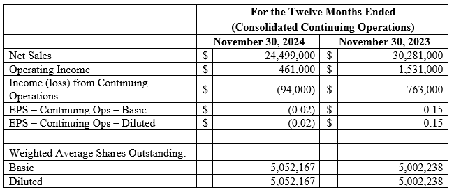 Discontinued Operations: On June 7, 2023 we announced we would be discontinuing our Tools segment with the last day of normal operations occurring on July 14, 2023. Just over a year later, on October 21, 2024, we completed the sale of the remaining real estate associated with our Tools segment for $1,800,000. The Company's assets and liabilities from this segment were gone prior to November 30, 2024 and will no longer report discontinued operations in our current year financials moving forward. Our discontinued operations generated approximately $1,271,000 from operating, investing and financing activities mainly related to closing activities and the sale of the real estate. Our Tools segment reported net income of $402,000 for the twelve months ending November 30, 2024 compared to net loss of $496,000 in the same period of fiscal 2023.