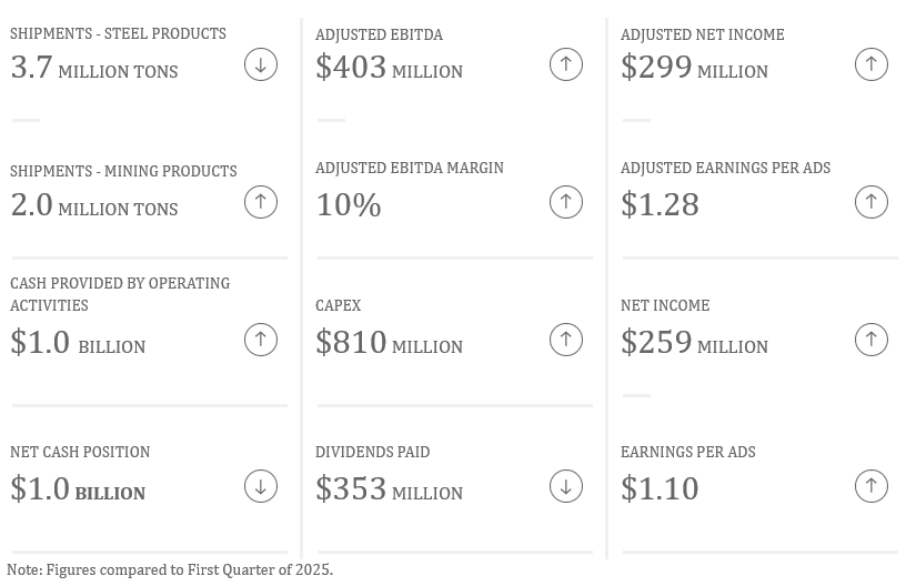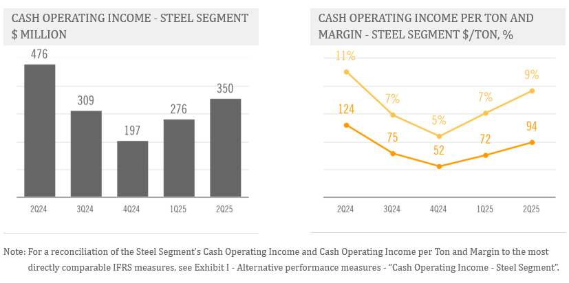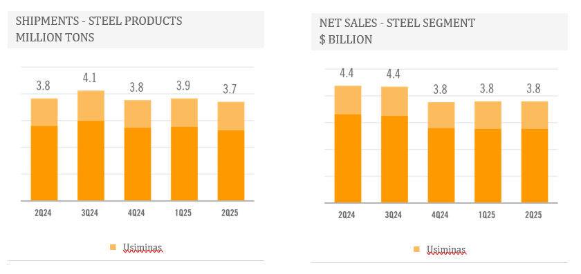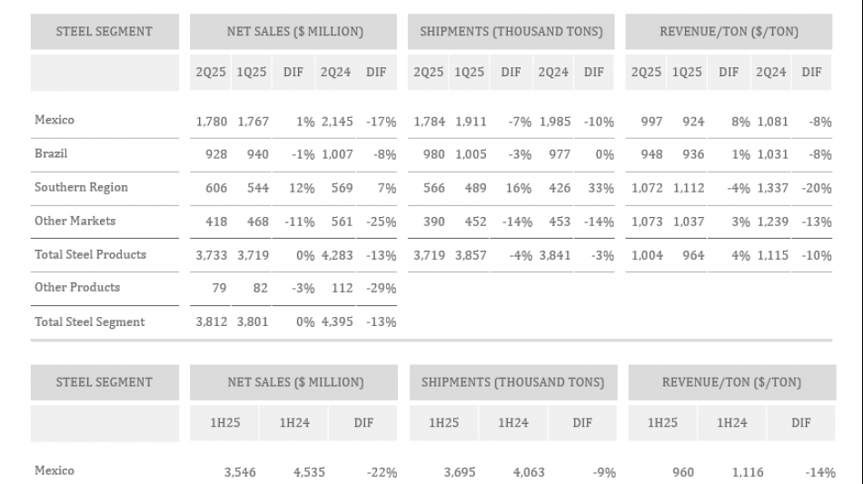 In the second quarter of 2025, the Steel Segment's net sales remained relatively stable sequentially. Higher realized steel prices were largely offset by reduced sales volumes, reflecting lower shipments in Mexico, Brazil and Other Markets, while shipments increased in the Southern Region.