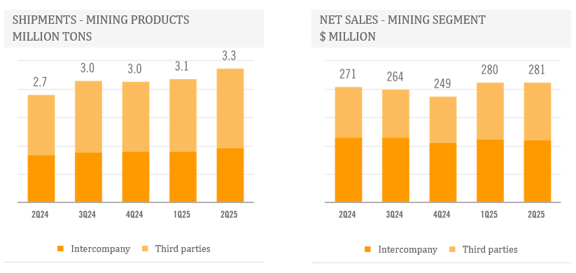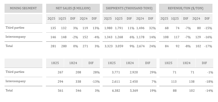 Mining Products Shipments (thousand tons) | 1,980 | 1,791 | 11 | % | 1,496 | 32 | % | 3,771 | 2,920 | 29 | % |