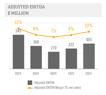 Ternium's Adjusted EBITDA Margin rose sequentially to 10% in the second quarter, primarily driven by higher realized steel prices, mainly in Mexico. Sales volumes of steel products declined slightly sequentially, largely due to lower shipments in Mexico and the US, partially offset by higher shipments in Argentina. The uncertain business climate in Mexico related to trade discussions weighed on local steel demand in the period. Sales volumes in the country were also affected by an increase of the US import tariff on steel and derivative products under Section 232 to 50%.