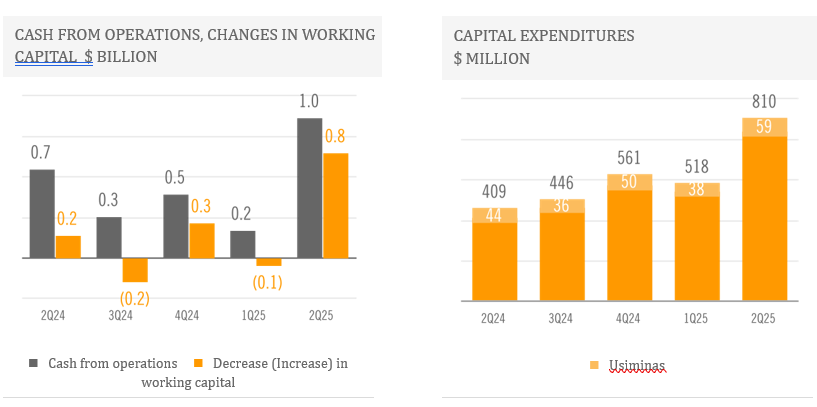 Cash from operations in the second quarter totaled $1.0 billion driven by a significant decrease in working capital, consistent with declining sales volumes. Capital expenditures amounted to $810 million in the period, mainly in connection with the ongoing expansion at the company's industrial center in Pesquería, Mexico. In addition, the company paid a dividend of $353 million corresponding to the balance of the total dividend declared for the year 2024. Ternium's net cash position as of the end of June 2025 was $1.0 billion, decreasing by $268 million since the end of March 2025.