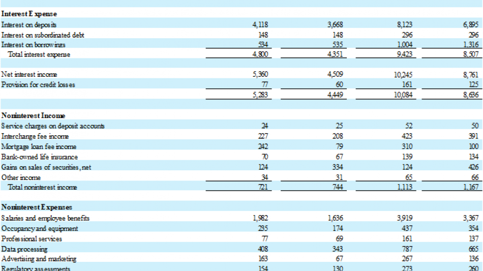 Noninterest income was $1.1 million and $1.2 million for the six months ended June 30, 2025, and 2024, respectively, a decrease of 4.6%. Contributing to noninterest income for the six months ended June 30, 2025, and 2024, were net gains on sales of available for sale securities of $0.1 million and $0.4 million, respectively. Proceeds from the sale of these securities were redeployed into assets with more attractive risk and return characteristics. Noninterest income, excluding gains on sales of securities, was $1.0 million and $0.7 million, an increase of 33.5%, for the six months ended June 30, 2025, and 2024, respectively.