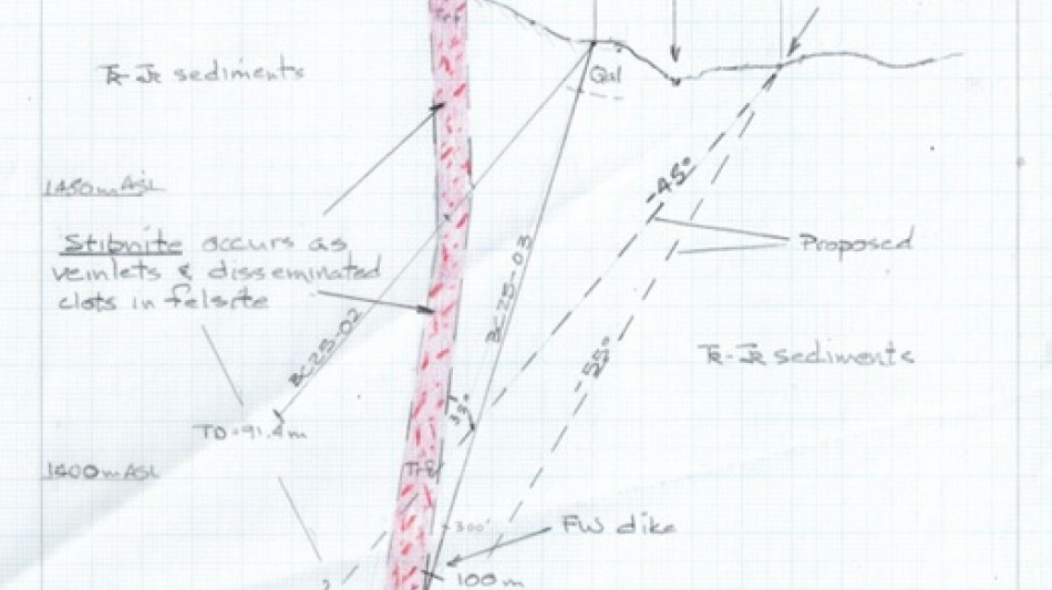 Apparent down-dip continuity of 285 ft in BC25-03, one of the thickest such intercepts documented in a U.S. Sb system in decades