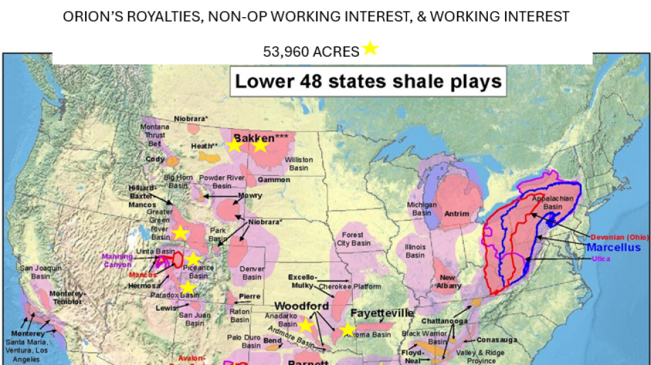 "This is our first entry into the Mississippi oil and gas fields. This property was drilled in 1977 and hit peak production of 10,000 bopd in 2011. The Mississippi property has produced 60,156,572 barrels and 5.9 bcf of gas since 1977. The Texas acquisition is in Matagorda County and there are active leases surrounding this 640 acre royalty acquisition. " Commented Tom Lull, CEO of Orion. On September 9, 2025 the US government is leasing 7,895 acres in Rio Blanco County Colorado, and Orion has 5,372 gross acres and 668 net mineral acres adjacent to these federal land tracts. Orion also has 9,280 acres or 14.5 square miles of royalties in the southeast corner of Pecos County Texas near the Terrell County Texas border. XTO drilled five vertical wells in 1963 on this Pecos county acreage to a depth of 23,000 feet and one well produced in excess of 60 bcf of natural gas. All five wells were plugged in 2021 and Orion purchased this 9,280 acre tract of land in Pecos County Texas in 2022. Orion has been notified that several oil companies have taken active leases in this area of Pecos County Texas for horizontal development. Orion now owns 53,960 mineral acres in the Bakken, Permian Basin, Piceance Basin, Arkoma Basin, Eagle Ford, Haynesville Shale, and Scoop Stack of Oklahoma."