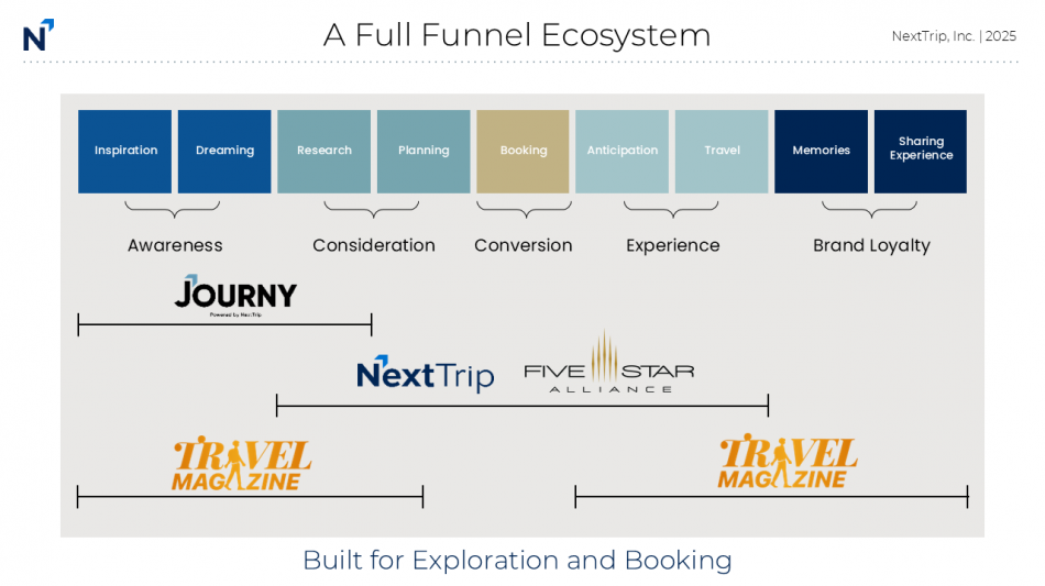 Travel Magazine 2.0 is strategically positioned to complement JOURNY, NextTrip's top-of-funnel streaming content platform, serving as a powerful mid-funnel bridge. Designed to educate, inspire, and empower travelers with high-quality, research-ready content, the magazine connects JOURNY's emotive storytelling to NextTrip's proprietary booking engine and its travel brands, including Five Star Alliance. As the platform evolves, it will deepen engagement through interactive features and personalized experiences, creating a full-circle vacation companion that supports travelers before, during, and after their journeys, becoming more useful and tailored with every interaction.