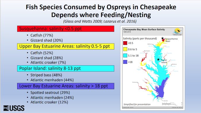 A presentation given by US Geological Survey scientists to the Menhaden Board of the Atlantic States Marine Fisheries Commission in August 2024 shows that past research, including research by CCB Director Dr. Bryan Watts, identified other species as being the primary prey of osprey in the higher salinity areas of the Bay. To make the leap that menhaden is the singular problem is not supported by the data.