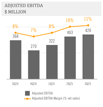 In the third quarter of 2025, Ternium continued improving its Adjusted EBITDA Margin, as steel production costs decreased, mainly reflecting lower raw material and purchased slab costs, as well as efficiency gains.