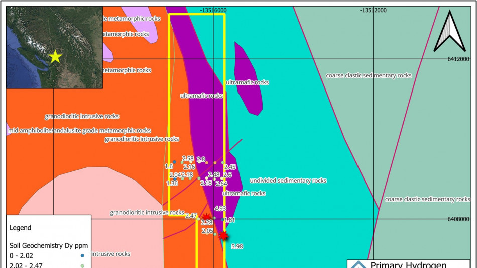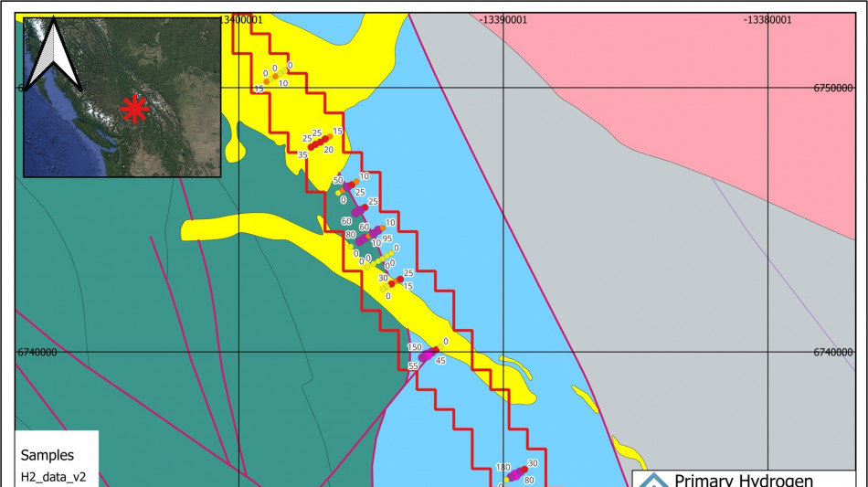 CALGARY, AB / ACCESS Newswire / November 24, 2025 / Primary Hydrogen Corp. (TSXV:HDRO)(FRA:83W0)(OTCQB:HNATF) (the "Company" or "Primary Hydrogen") is pleased to announce results from its field sampling program at the Crooked Amphibolite, Coquihalla, and Cogburn projects (collectively the "BC H2 Projects") in British Columbia, Canada. The program identified an approximately 8-kilometre-long trend of elevated hydrogen readings at the Crooked Amphibolite Property, with values up to 180 ppm, as well as an anomalous heavy rare earth element (HREE) zone at the Coquihalla Property with total rare earth oxides (TREO) of 170 ppm.