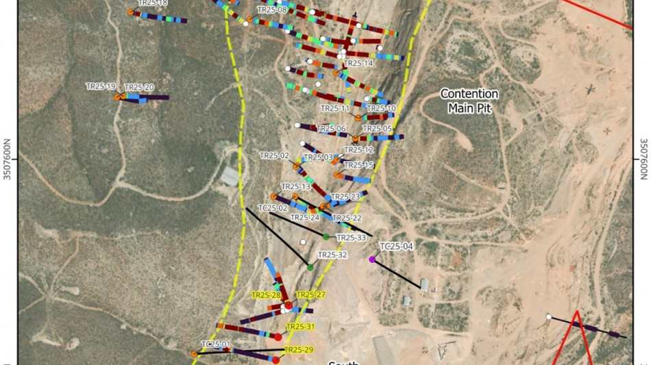 Hole TR25-30 - Was collared in the south end of the southern portion of the Contention Target area to test the Grand Central portion of the Contention system. It was drilled westerly and to a depth of 135 meters. The drill hole intersected one zone of oxidized mineralization, from 112.5 to 121.6 meters, 9.1 meters averaging 15.55 gpt AgEq (13.65 gpt Ag and 0.027 gpt Au). The drillhole leaves the mineralization open to depth and to the west.