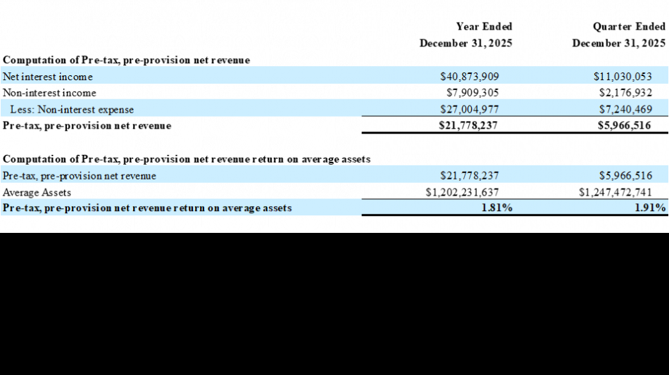 Total non-interest income for the fourth quarter ended December 31, 2025, of $2.2 million increased $407,715, or 23.04%, compared to $1.8 million for the same period in 2024. Total non-interest income for the year ended December 31, 2025, grew to $7.9 million, compared to $7.2 million for the year ended December 31, 2024, an increase of $727,089, or 10.12% year-over-year. Total non-interest expenses increased 13.19%, for the fourth quarter comparison period, and $1.5 million, or 6%, year-over-year.