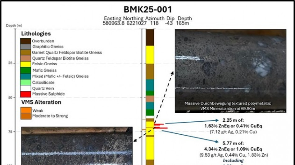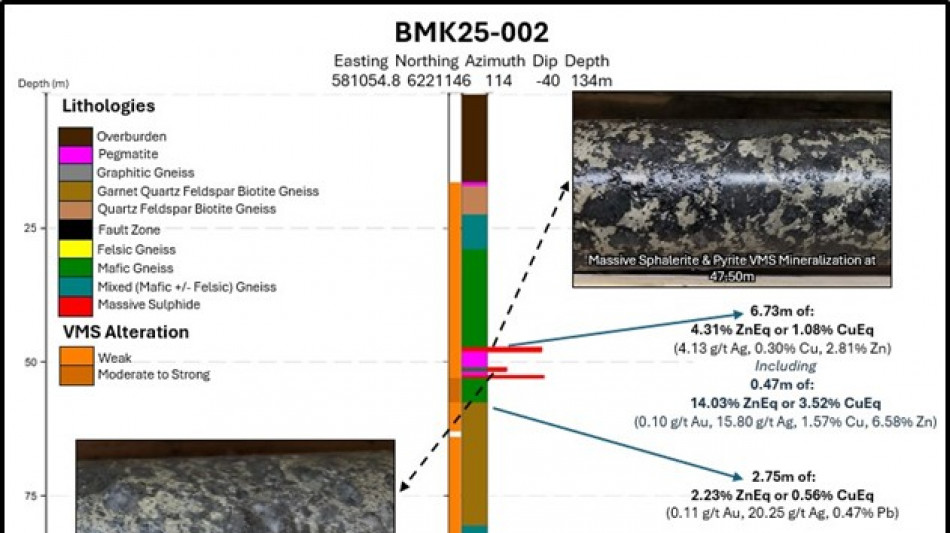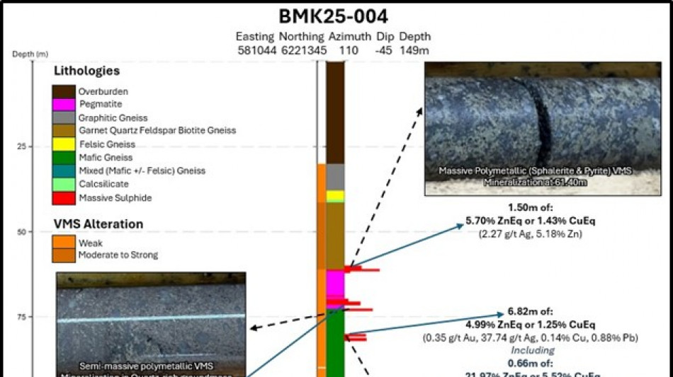 Hole BMK25-005 was of particular note, intersecting multiple intervals of high-grade mineralization in an area previously thought to be barren. This discovery significantly enhances the exploration potential on the southern side of the Deposit. Hole BMK25-004 upgraded mineralization on the northern shallow extent of the Deposit, intersecting 14 m of zinc-copper mineralization in three intervals, which includes the discovery of a new 6.82 m silver-gold-lead zone 5.5 m below the lower zone.