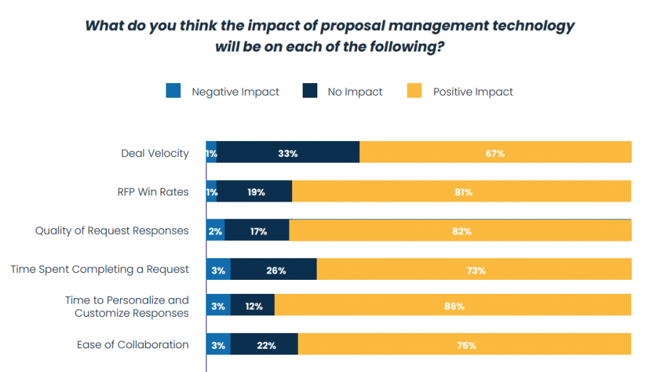 Expectations for proposal AI and automation are sky-high. 81% of respondents expect proposal management software to lead to higher RFP win rates, while 73% expect to complete requests faster, 67% anticipate faster deal velocity, and 77% expect lower proposal generation costs. In terms of process, 86% expect AI to improve the time required to personalize and customer RFP responses, while 82% anticipate improvements in response quality and 79% expect reduced time spent managing content.