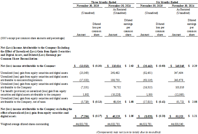 Net loss attributable to the Company excluding the effect of unrealized gain or loss from equity securities and digital assets net of taxes for the three months ended November 30, 2025 was $7.3 million ($0.17 per diluted share) compared to net income of $46.1 million ($1.05 per diluted share) for the three months ended November 30, 2024 (as restated). The six-month figures, as of the same end dates, are a net loss of $8.6 million ($0.20 per diluted share) in 2025 compared to net income of $53.3 million ($1.21 per diluted share) in 2024 (as restated).