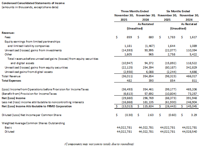 For the six months ended November 30, 2025, FRMO's net loss attributable to the Company was $26.4 million ($0.60 per diluted share), compared to net income of $145.0 million ($3.29 per diluted share) a year earlier.