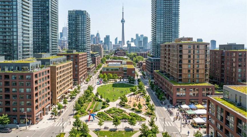A vibrant mixed-use, mixed-income neighbourhood in Toronto - the goal of well-designed inclusionary zoning policy.