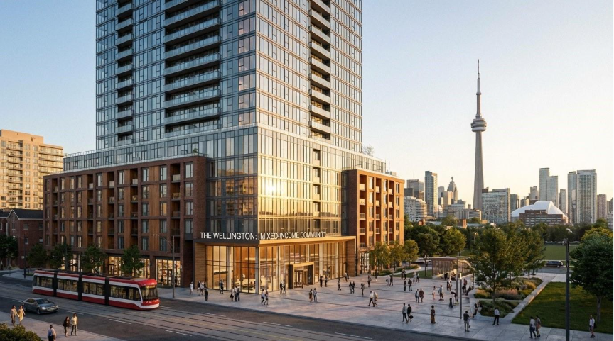 A modern mixed-income residential tower integrated into Toronto's urban fabric.