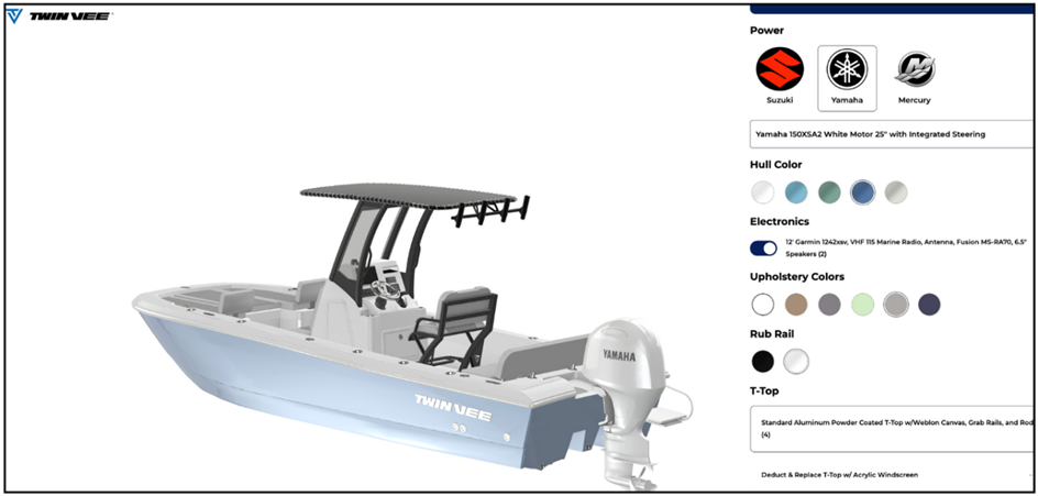 Twin Vee also unveiled its sophisticated online 3D configurator alongside the relaunch of its 22 BayCat. This interactive tool is seamlessly integrated into the Company's newly revamped website, which itself offers a modern design and intuitive navigation for an enhanced user experience. The 3D configurator provides customers with an unparalleled ability to visualize and personalize their future vessel with complete transparency through a more realistic build-and-price tool.
