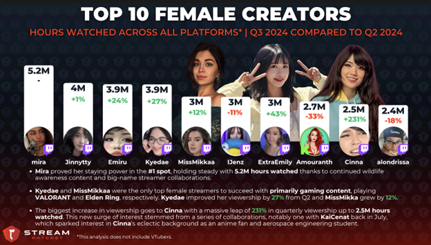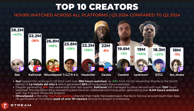 Spanish content surged by 59% on Kick, making it the second most-watched language on the platform with 129 million hours. Meanwhile, new entrants like Chzzk and Rumble continue to offer alternatives, engaging unique audiences across diverse regions.Top Creators of Q3 2024: