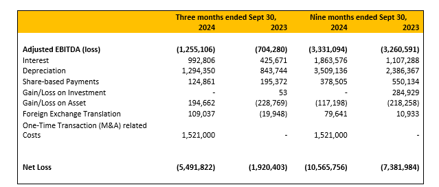 The comprehensive loss of ($5,491,822) in Q3 2024 compared to ($1,920,403) Q3 2023 was due to higher depreciation expenses, interest charges, and $1.5M one-time merger transaction related advisory fees. Excluding external partner cost and depreciation, the SG&A expenses reduced by $592K. This showcases our efforts to reduce overhead cost and achieve near-term profitability.