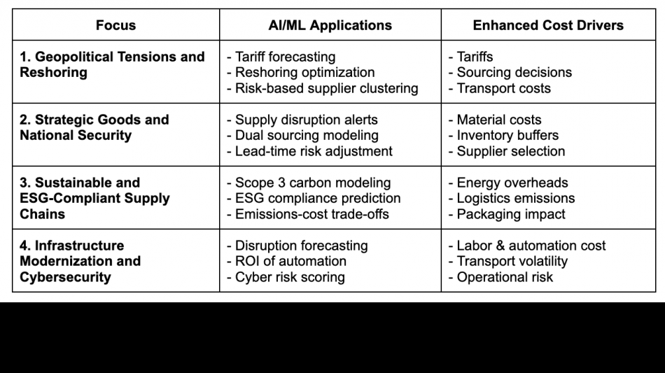 Lee's insights highlight the urgent need for businesses to adopt advanced tools-such as AI-powered total landed cost models-to navigate growing complexity and build resilient, secure, and sustainable global supply chains. This requires a wide range of structured and unstructured data, including tariff schedules, trade agreements (e.g., USMCA, IPEF), political risk indices, labor market data, and global commodity prices (e.g., LME, CME). ESG modeling depends on environmental metrics like carbon intensity, transportation emissions, and Scope 3 data. Complementary inputs-such as freight indices, supplier ESG scores, and cyber risk data (e.g., CISA alerts)-sharpen forecasting and risk evaluation. These predictive models rely on near real-time public and proprietary data to simulate complex global sourcing dynamics.