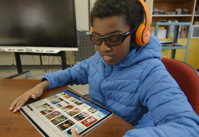 A student uses a tablet and headphones to access accessible books using Bookshare in a classroom.