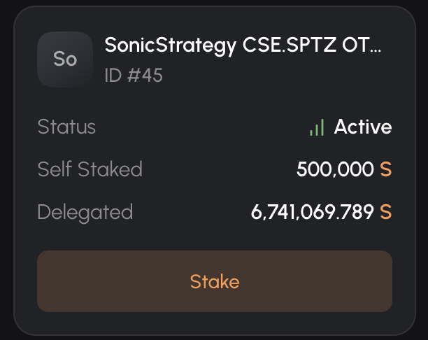 Figure 1 - Screenshot from Sonic Labs Validator Portal showing SonicStrategy's institutional-grade validator (ID #45), with 500,000 S tokens self-staked and 6,741,069.789 S tokens delegated by third-party token holders.