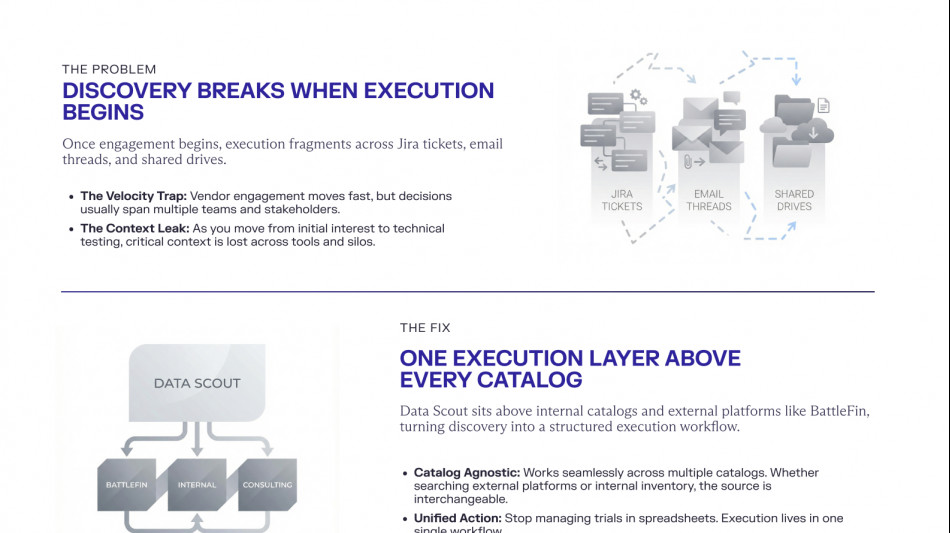 Through its integration with BattleFin, teams can move directly from external data discovery into structured vendor engagement, including testing data, conducting alt-data powered research, and consuming Insights on the Exabel platform, part of the BattleFin Group platform. Data Scout is also designed to support market data consultants, allowing them to connect their own proprietary catalogs and manage discovery, trials, and onboarding workflows across clients without losing visibility into negotiations, obligations or outcomes.