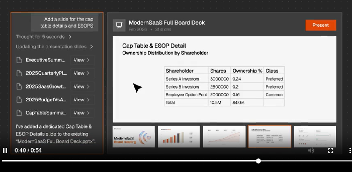 Coreworks' AI SuperAnalyst connects to ERP systems, CRM platforms, financial models, and spreadsheets. It semantically understands the data and generates complete deliverables for spreadsheet models, written analysis, and slide presentations - directly from source data. Coreworks has a canvas for producing presentations and reports complete with tables and charts to ensure that every report matches a company's style and template. An Excel sheet links back to the source data - all in one place.