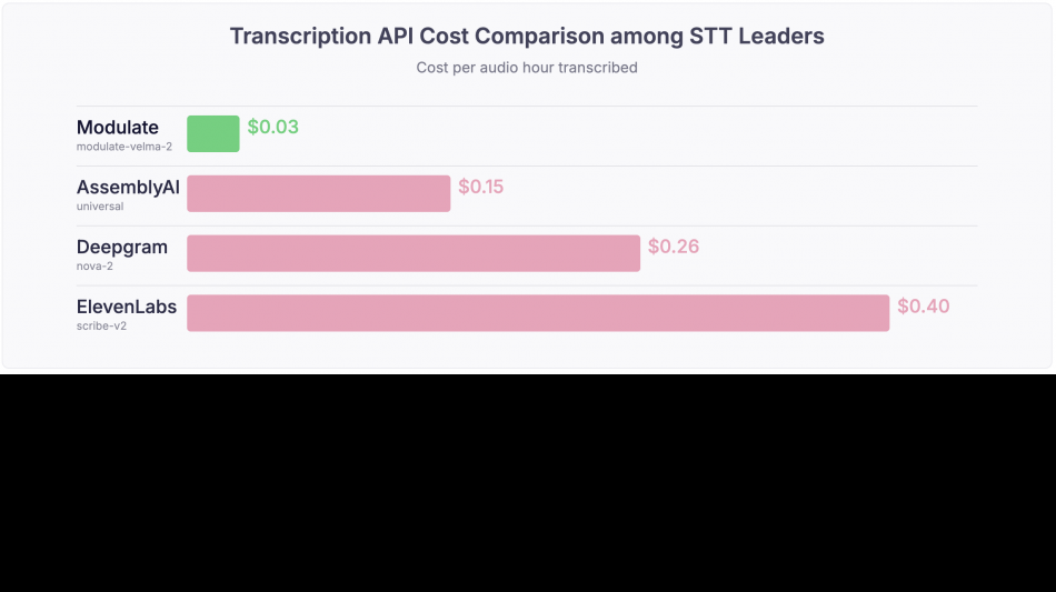 BOSTON, MA / ACCESS Newswire / March 18, 2026 / Modulate, the frontier conversational voice intelligence company, today announced Velma Transcribe, a speech-to-text API delivering high-accuracy, low-latency transcription at 90% lower cost per hour than other leading transcription providers. This significantly lower price point represents a fundamental shift in the economics of transcription. For a fraction of the cost, Modulate unlocks affordable speech-to-text transcription for every audio conversation in the world, empowering real-time voice agents, call center platforms, social apps, and more with industry-leading transcription tools at a global scale.
