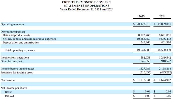 TARRYTOWN, NY / ACCESS Newswire / March 24, 2026 / CreditRiskMonitor.com, Inc. (OTCQX:CRMZ) reported operating revenues of $20.1 million, an increase of approximately $314 thousand or 2%, for the year ended December 31, 2025, as compared to 2024. The Company reported operating income of approximately $582 thousand, a decrease of approximately $668 thousand or 53%, for 2025 compared to 2024. The decrease in operating profitability was primarily driven by an increase in expenses related to employee compensation and professional services incurred during transformation initiatives. The Company reported net income of approximately $1.02 million, a decrease of approximately $657 thousand or 39%, for 2025 as compared to 2024. The Company plans to continue making investments in transformation related to new systems, processes, and AI tools over the next twelve to twenty-four months, funded via its internal operations and significant cash balances built up over the years. It expects to produce significant productivity gains from these investments that should translate into improved margins starting in 2027.