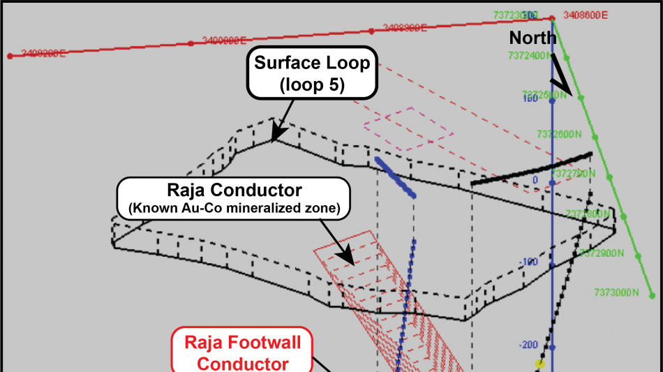A final loop was set-out in the Raja area, using drillholes PAL0171 and PAL0355 (loop 5; see figure 1). A smaller, 70m by 110m sized, 'off-hole' conductive anomaly was measured on the mid-northern margin of the Raja zone of gold-cobalt mineralization. Modelling of the conductive anomaly places a plate-anomaly in the footwall of the Raja zone of mineralization, only 30 metres below the known zone by approximately (refer to Figure 5). While this general area has received some drilling previously, no drilling has penetrated the specific area defined in the modelled EM plate, and as such presents a very compelling drill-target.