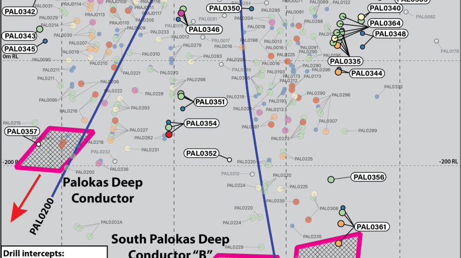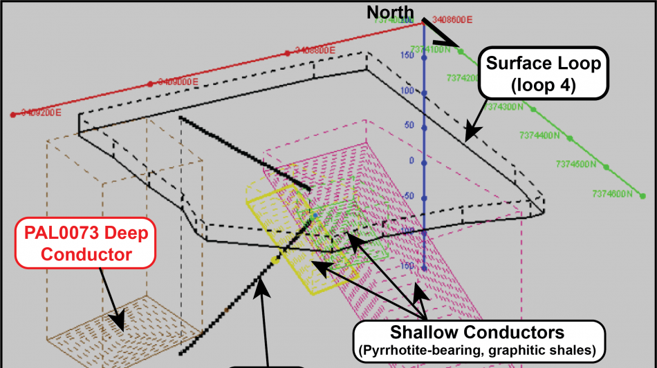 At Palokas, a strong EM-conductive body is interpreted on the lower, northern margin of the mineralized zone, extending down-dip from PAL0200 (loop 3), with the top of this conductor modelled at -129mRL, continuing a further 135 metres in the down-dip direction. This modelled conductor initially appears coincident with the lower portions of the deeper areas of the Palokas mineralized zone however, it is interpreted to be separated from the main Palokas mineralized zone. The anomaly isn't readily explained by simply enlarging the presently known geometry of the Palokas mineralized system down-dip with a northerly plunge and as such, these results suggest an additional lens of gold-cobalt mineralization may exist beyond the known limits of mineralization in the deeper areas of the Palokas zone (refer Table 1, and to 3-D projections in Figure 2 and Figure 3).