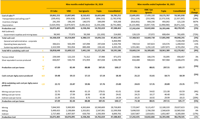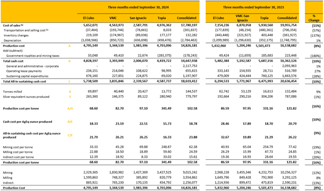 Silver equivalents are calculated using 84.04:1 (Ag/Au), 0.03:1 (Ag/Pb) and 0.04:1 (Ag/Zn) ratio for Q3 2024; an 81.83:1 (Ag/Au), 0.04:1 (Ag/Pb) and 0.05:1 (Ag/Zn) ratio for Q3 2023, respectively.