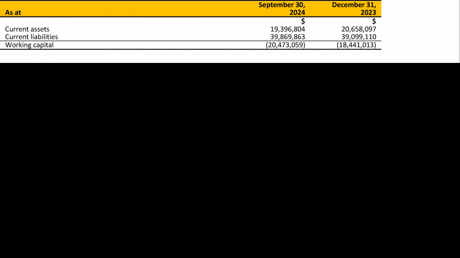 As of September 30, 2024, the Company had cash and cash equivalents of $1.6M and negative working capital of $20.4M; subsequent to the end of the quarter, the Company closed an equity financing on October 30 for C$8.72M.