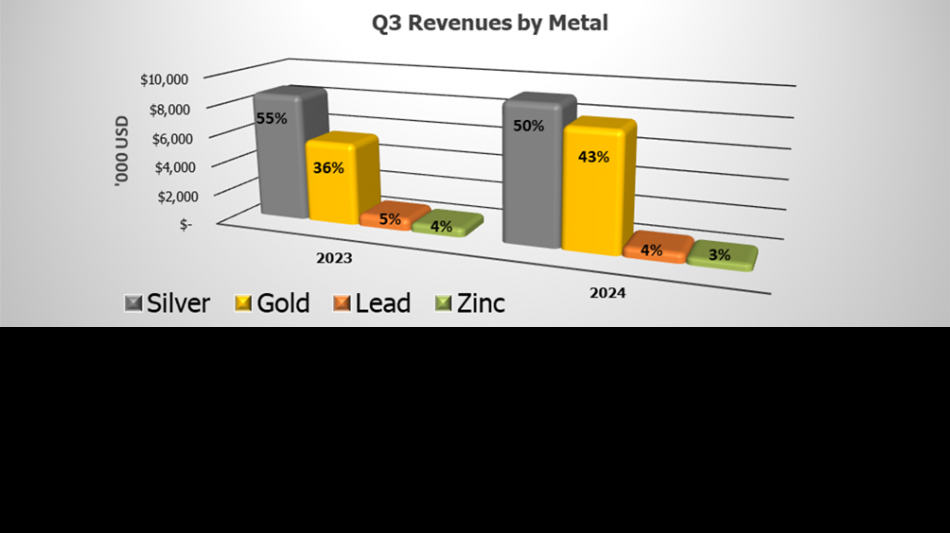 Revenue for the quarter of $18.3M represented a 17% increaseover Q3 2023, and a decrease of 11% over the previous quarter. Consolidated revenue for the quarter was generated by a realized average price of $29.43 per silver ounce, $2,477 per gold ounce, $0.93 per pound of lead, and $1.25 per pound of zinc.