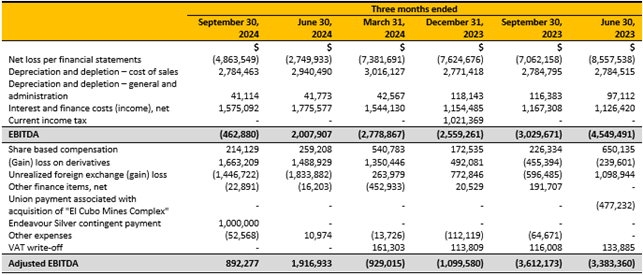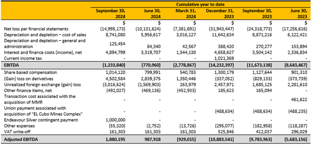 During the quarter the Company confirmed an important production milestone - over 3,000,000 AgEq ounces had been produced at El Cubo since the restart of operations in late 2021. For this purpose, AgEq has been calculated using an 82.77:1 (Ag/Au) ratio from October 1, 2021, until September 20, 2024.