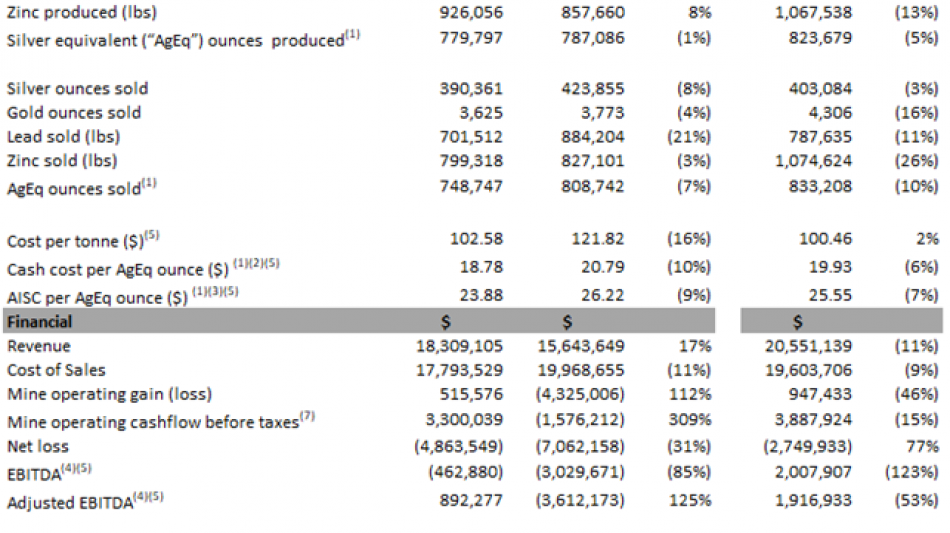 Production for the quarter of 779,797 AgEq derived from 413,607 ounces of silver, 3,617 ounces of gold, 806,945 pounds of lead and 926,056 pounds of zinc.