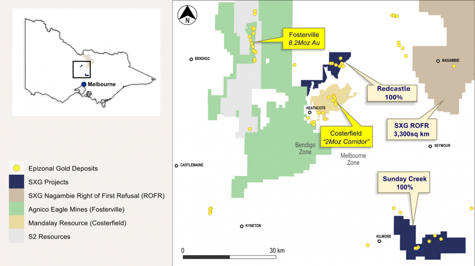 The Sunday Creek epizonal-style gold project is located 60 km north of Melbourne within 16,900 hectares of granted exploration tenements. SXG is also the freehold landholder of 133.29 hectares that form the key portion in and around the main drilled area at the Sunday Creek Project.