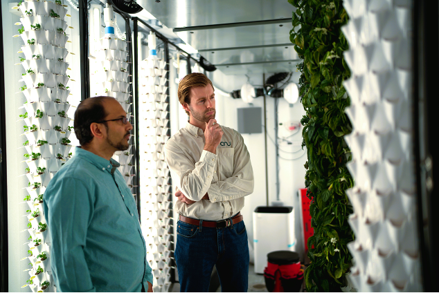 Scott Massey (right), anu's co-founder and CEO, and Sven Nelson, anu's senior vice president of research, inspect fruiting tomato and pepper crops inside their Pure Produce® Container. The USDA's National Institute of Food and Agriculture awarded anu a $175,000 Phase I SBIR grant to develop the containers.
