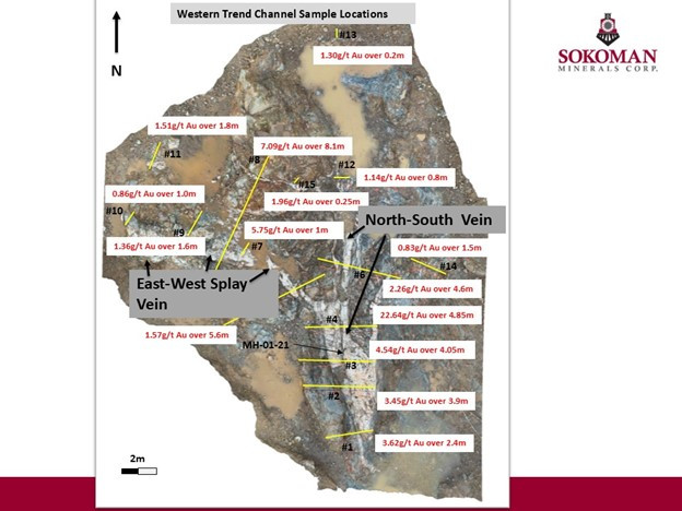 The remaining channel sample results, 21 samples from channels 8 to 15, from the Western Trend trench (see channel sample location map) confirm that an east-west trending, high-grade vein system (the East-West Splay) occurs in the Western Trend. It is highlighted by channel #8, which returned 8.10 m of 7.09 g/t Au, including 3.20 m of 14.29 g/t Au. A total of 41.2 m, representing 57 separate samples, ranging from 0.15 to 1.10 m (with a median length of 0.73 m), returned an average weighted grade of 5.79 g/t Au with all samples analyzed by total pulp metallic assaying at Eastern Analytical Ltd. in Springdale, NL.